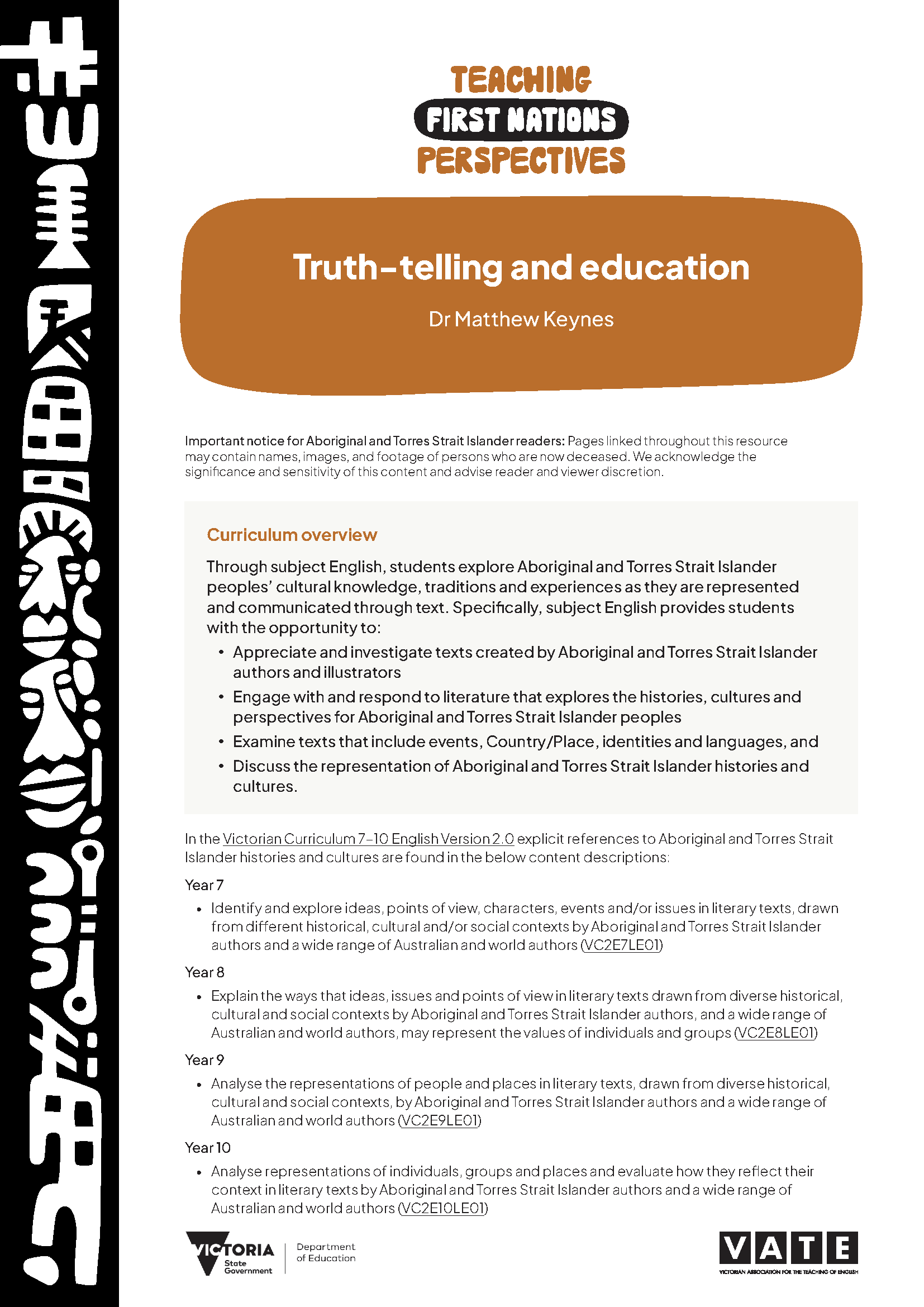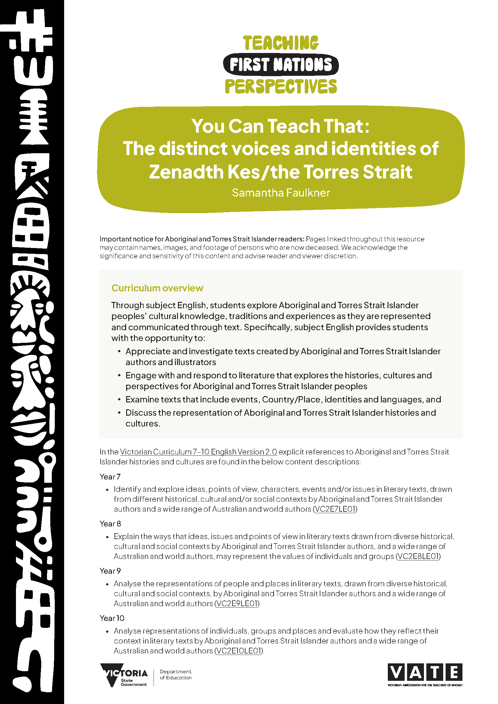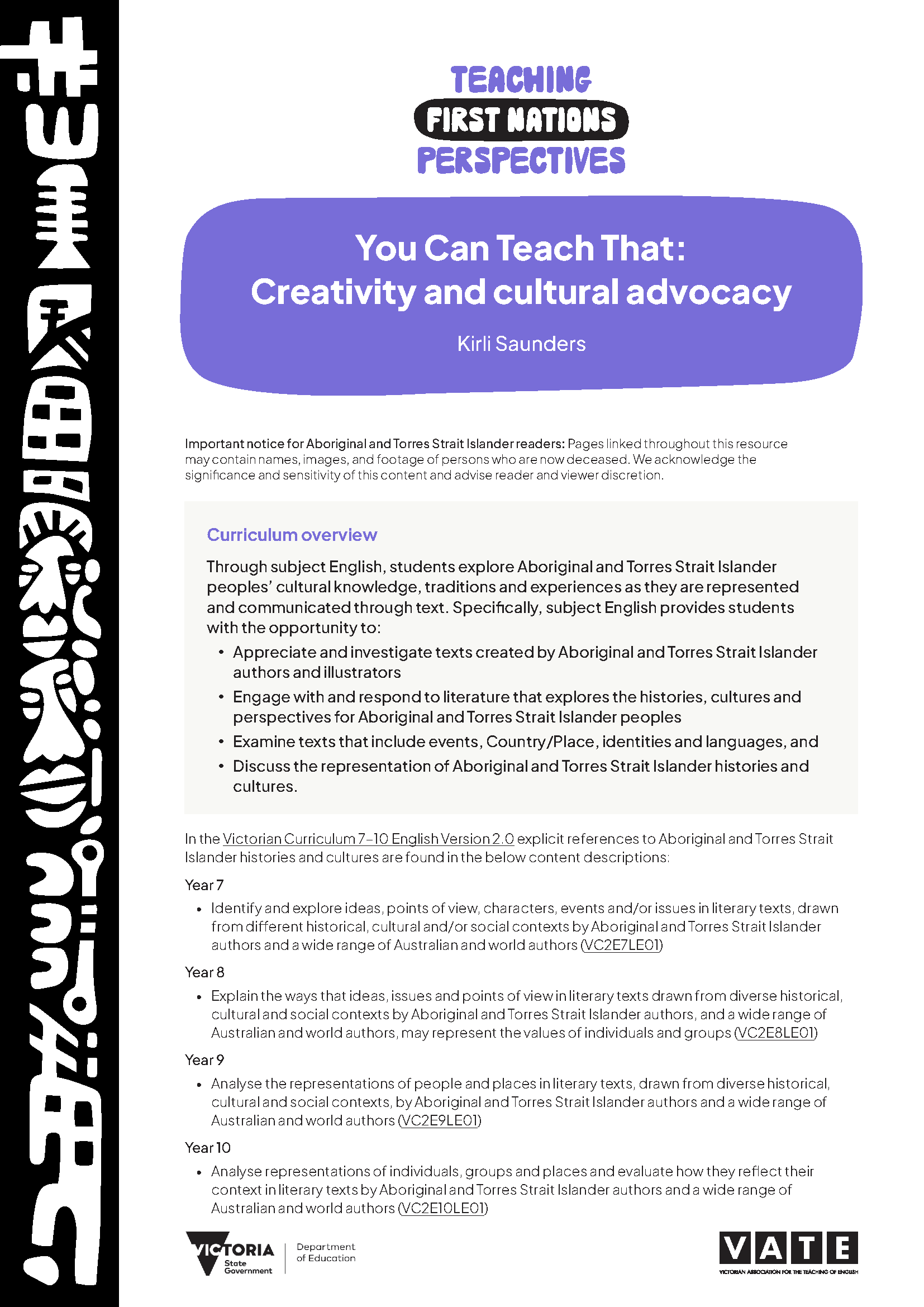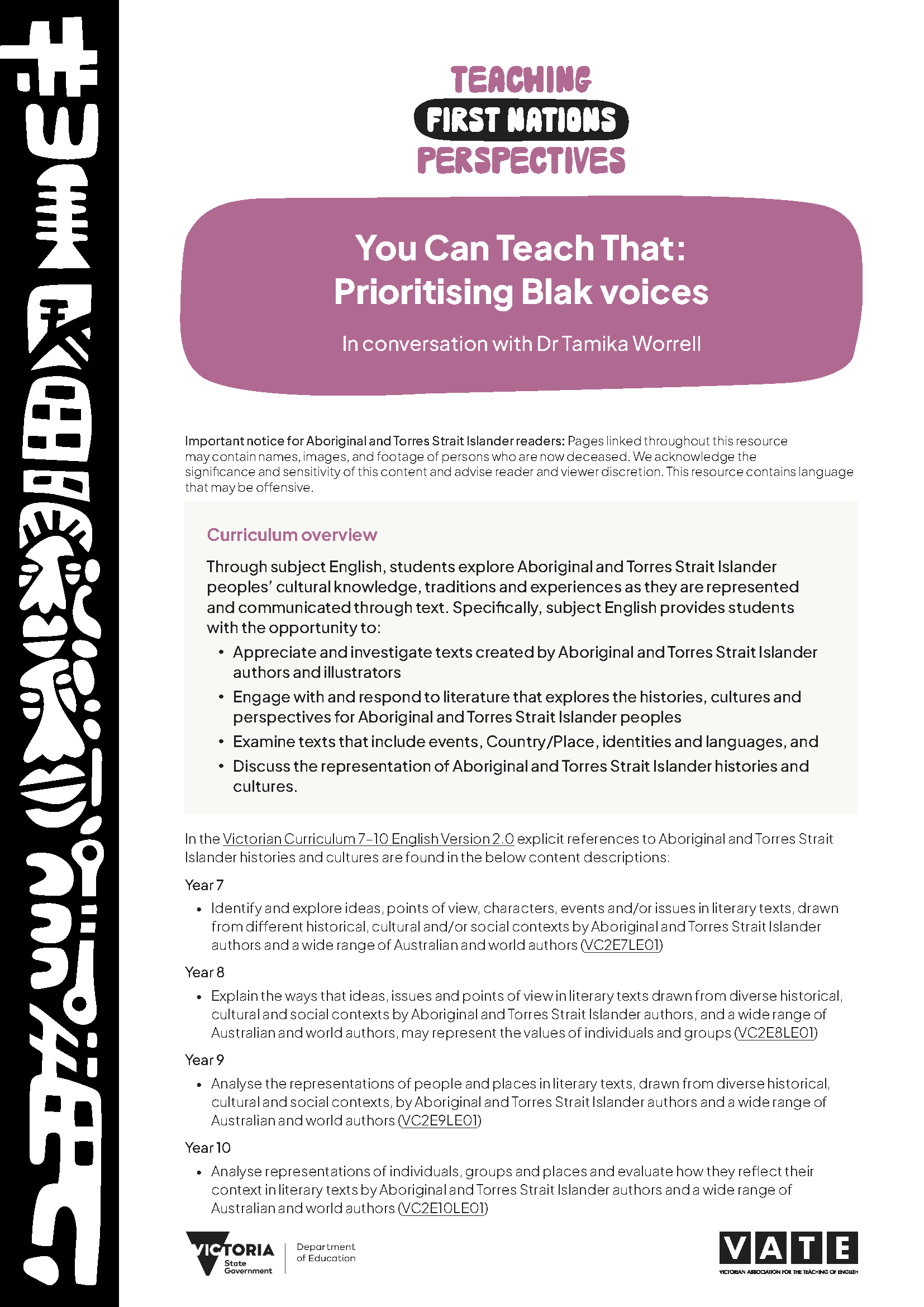 VATE's You Can Teach That: Teaching First Nations Perspectives series is designed to support English teachers to build their own Aboriginal and Torres Strait Islander cultural responsiveness in order to provide their students with accurate, informed and culturally appropriate context, knowledge, skills, language and pedagogies. The You Can Teach That: Teaching First Nations Perspectives series consists of a suite of on-demand videos with First Nations academics, commentators, and writers, as well as complementary teaching resources that explore how to use the insights from each in the English classroom. The purpose of these resources is to support, inform and engage English educators in the development of their understanding and teaching of Aboriginal and Torres Strait Islander voices and perspectives in the English classroom. These resources have been written by Emma Jenkins and reviewed by Darby Jones. The artwork for this program has been generously provided by Aretha Brown and has been reproduced with her permission. The music in this program is 'The Red Sand Sea' by Robbie Miller and is used under license by APRA-AMCOS. The You Can Teach That: Teaching First Nations Perspectives program is funded the the Victorian Department of Education's Strategic Partnerships Program. |
